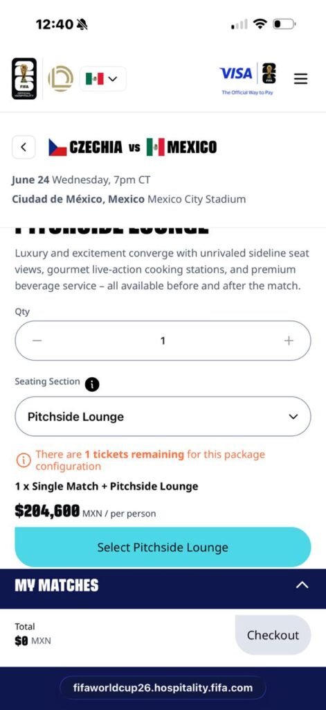 A partir de ahí, los precios aumentan dependiendo de la cercanía a la cancha y la experiencia. En opciones más exclusivas como el “Pitchside Lounge”, los costos pueden superar los 300 mil pesos en encuentros como México frente a Sudáfrica, mientras que otros partidos superan los 200 mil pesos.