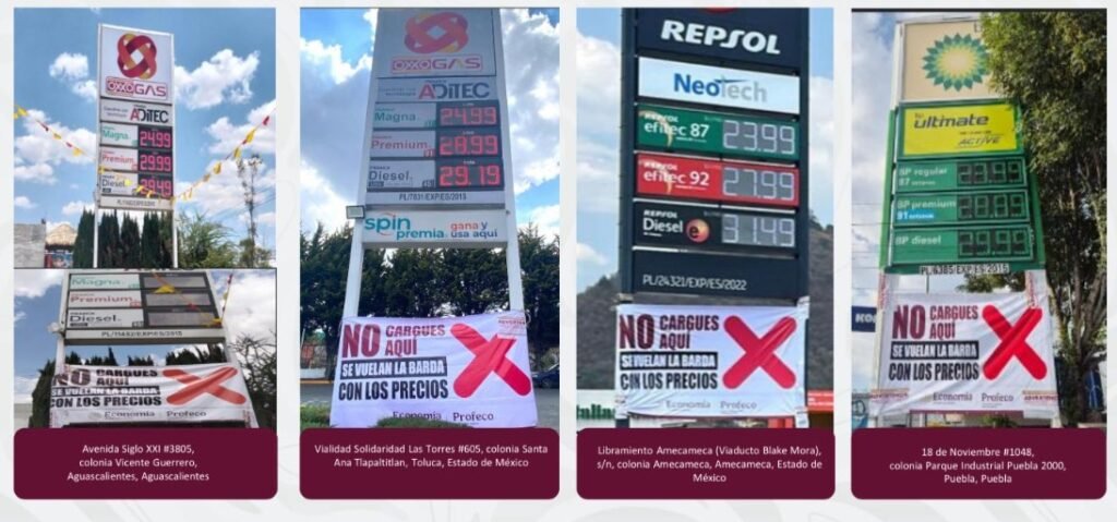 Escalante Ruiz detalló además que en una estación de Mobil, ubicada en Temixco, Morelos, se colocó lona por vender el litro de gasolina regular en 24.29 pesos. El mismo precio fue detectado en una gasolinera de Gulf en Puebla, Puebla, por lo que también fue exhibida por incumplir con el objetivo fijado.