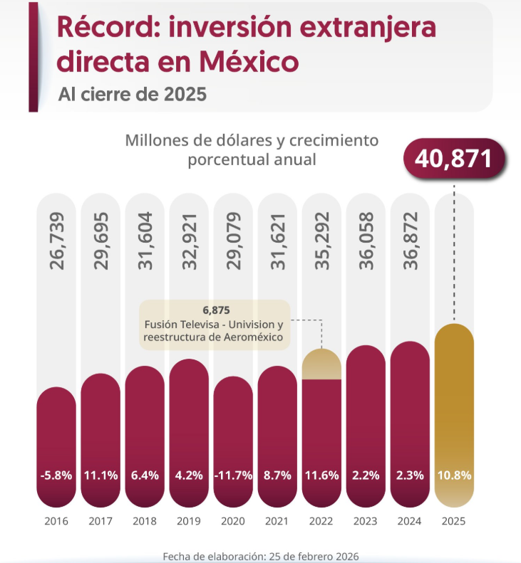 Ciudad de México, a 26 de febrero de 2026.– Al cierre de 2025, México registró la cifra más alta de Inversión Extranjera Directa (IED) en su historia, con un total de 40 871 millones de dólares, de acuerdo con datos oficiales de la Secretaría de Economía. Este monto representa un incremento del 10.8 % en comparación con 2024, consolidando una tendencia de crecimiento de cinco años consecutivos de IED.