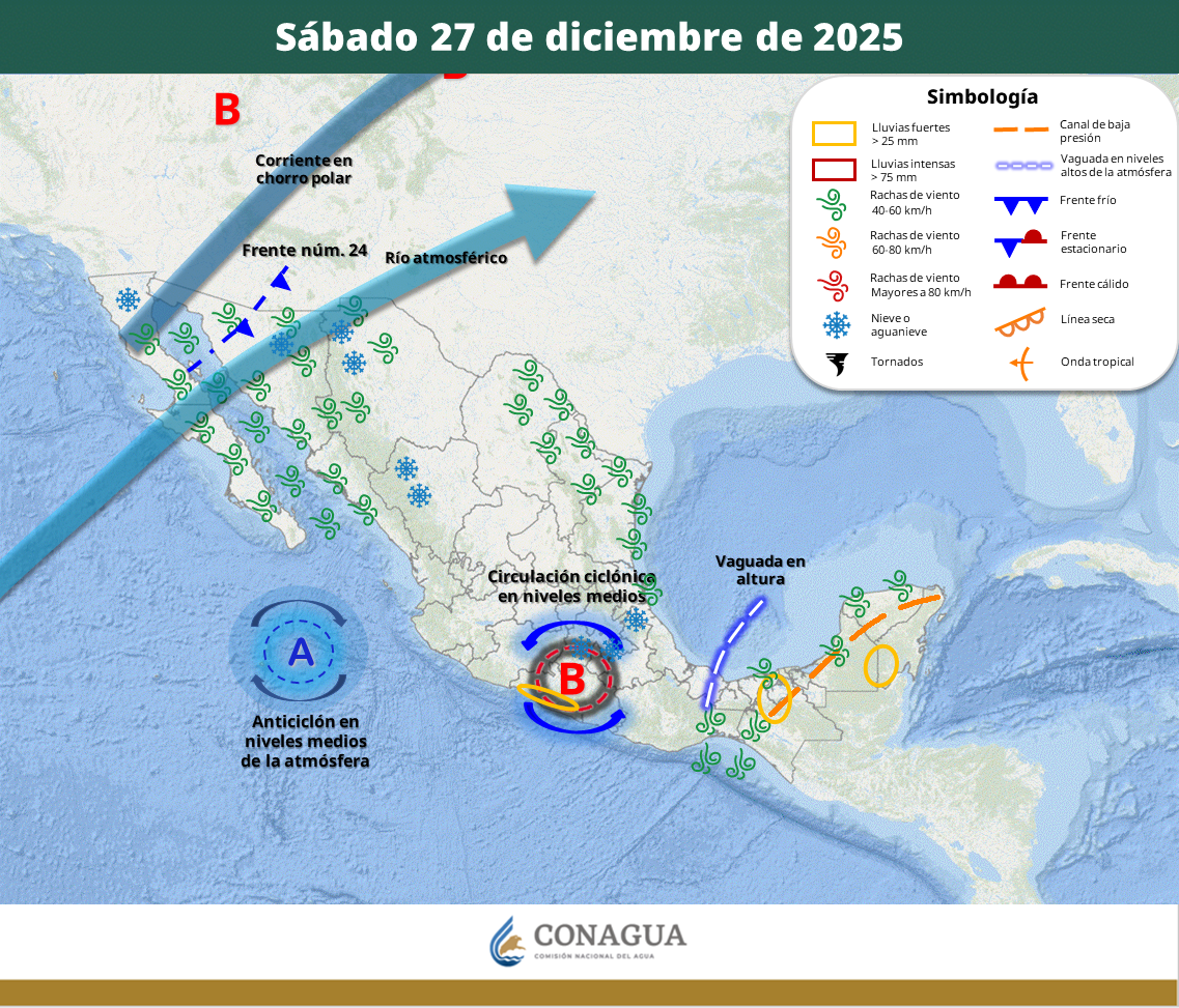 Ciudad de México, a 27 de diciembre de 2025.- Lluvias muy fuertes en la región olmeca de Veracruz, el norte de Chiapas, sur y este de Tabasco y el suroeste de Campeche generadas por el frente frío número 24 que se desplazará por el noroeste de México y por una vaguada polar, pronosticó el Servicio Meteorológico Nacional para este sábado.