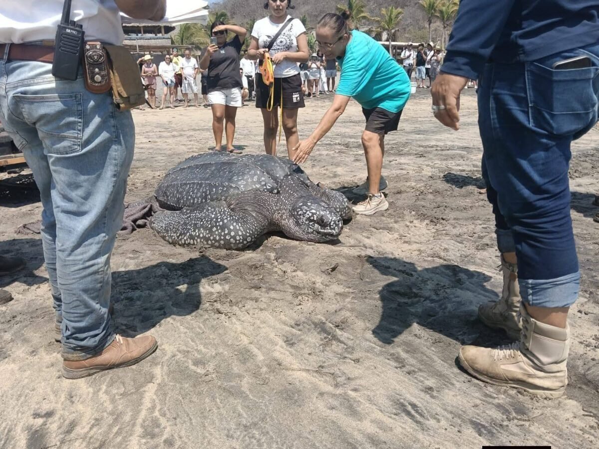 SANTA MARÍA TONAMECA, Oax., a 17 de marzo de 2026.- Un fenómeno de mar de fondo combinado con marea alta provocó una escena inusual en la costa del Pacífico mexicano: una tortuga laúd de aproximadamente 300 kilos fue arrastrada dos kilómetros tierra adentro en el municipio de Santa María Tonameca, lo que obligó a desplegar un operativo de rescate para salvarla.