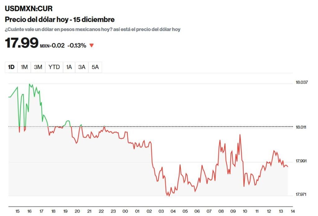 Ciudad de México, 15 de diciembre de 2025 — El peso mexicano inició esta jornada fortalecido frente al dólar estadounidense, manteniéndose cerca de 18 pesos por dólar, su nivel más bajo de los últimos días y uno de los mínimos semanales, según datos de mercado.
